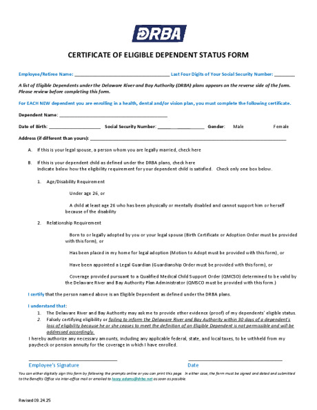 Following enrollment of a new dependent, you must complete the Certificate of Eligible Dependent Status Form for each new dependent.